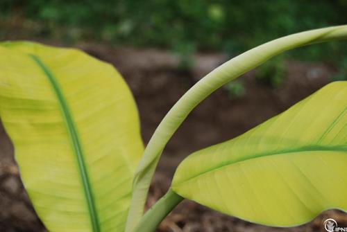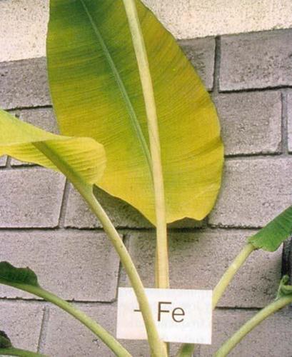 Iron deficiency causes the banana leaves to become yellowish-green and later totally yellow. Interveinal chlorosis starts from the bottom and the margin of the leaves and progresses to the leaf tips giving the leaves a mottled appearance.