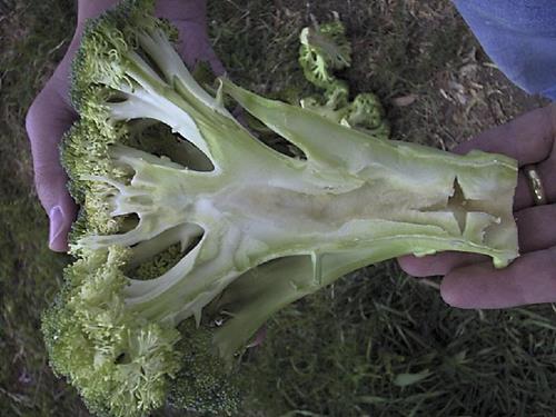 First within the stems watery tissue arises, which turns brown or sometimes black in process of time. Then affected tissue dehumidifies and hollow areas develop.