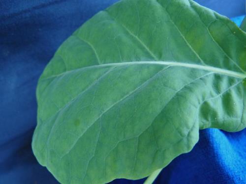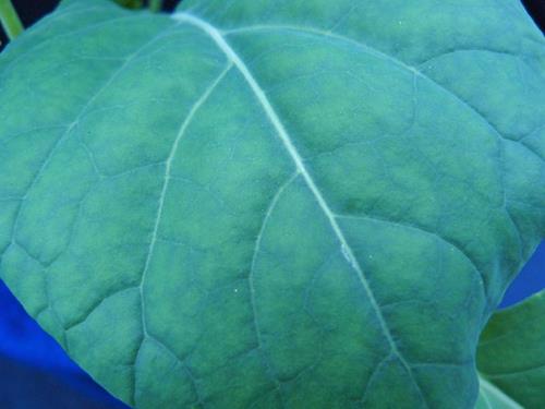 Young leaves show yellogreen mottling, caused by interveinal chlorosis. All leaves are a paler green than normal. Leaf blades are enlarged.