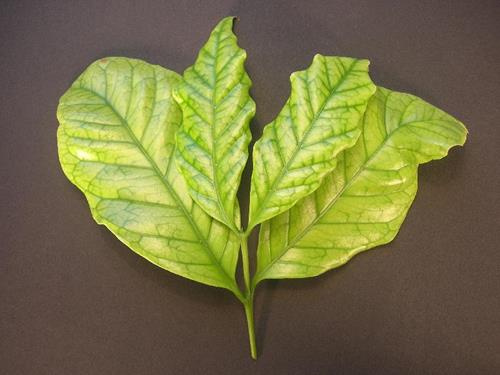 Young leaves turn pale green and then a chlorosed yellow or white.