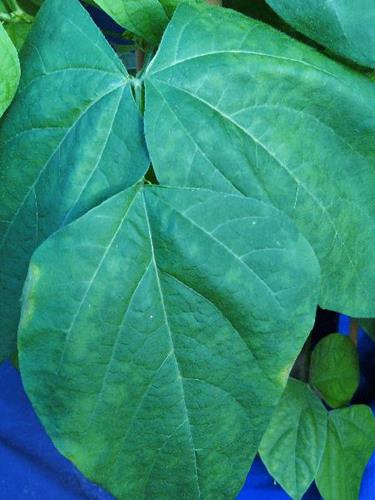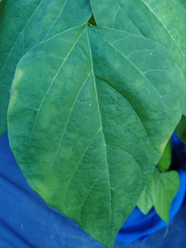 Symptoms start with a uniform intercostal chlorosis on young leaves. Older leaves show irregular mottling in the beginning. Finally chlorosis spreads over the complete foliage when deficiency continues, only veins remain light green on pale yellow leaf blades.