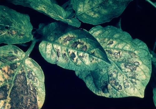 Manganese deficiency is similar but here intercostal yellowing starts on younger leaves and the necrosis is usually in spots along the line of the veins.