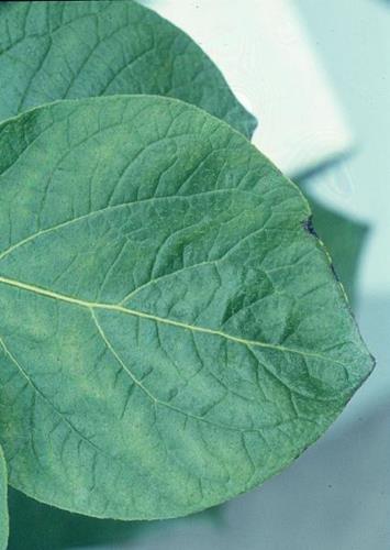 Symptoms start on younger leaves. Leaf veins first remain green, but black spots develop along the line of the veins. Slight cupping of entire leaflets. Leaves near shoot tip small and chlorotic/necrotic.