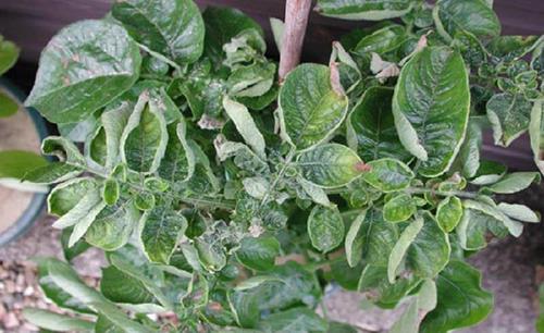 The leaves are deformed and fold inwards ('fern leaf of potato' ).