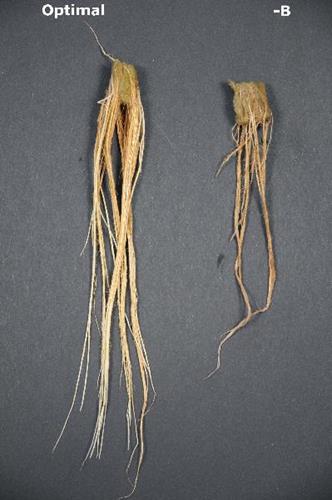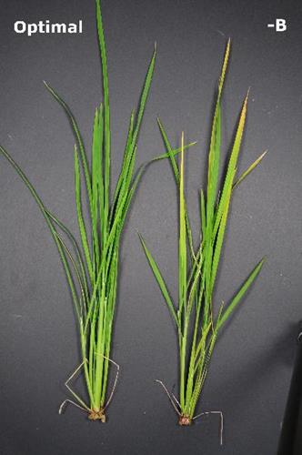 Often the leaf tips are white and rolled. Severe deficiency results in necrosis and subsequent death of the growing point. If rice is affected by B deficiency during panicel formation, the plants may fail to produce panicels.