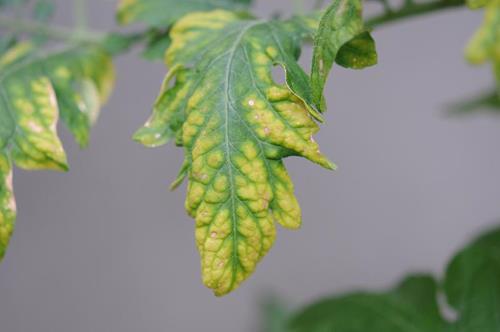 At severe deficiency, the intercostal areas of the leaves may become chlorotic, too.