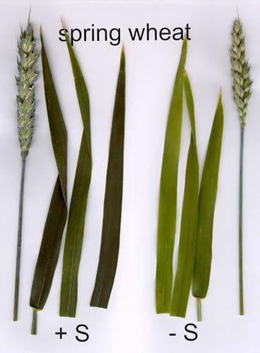 N deficiency and root damage may cause similar symptoms. Symptoms of N and S deficiency in wheat and other small grains are very similar, thus a tissue analysis is often necessary to reveal the cause.