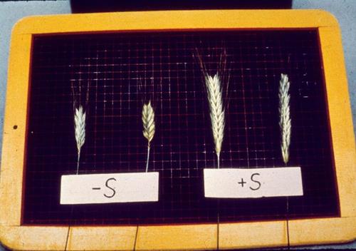 S deficient plants show a bright chlorotic, yellow green colour and stunted growth. Chlorosis caused by sulfur deficiency can often be observed at the young leaves first - in contrast to deficiency symptoms caused by a lack of nitrogen.